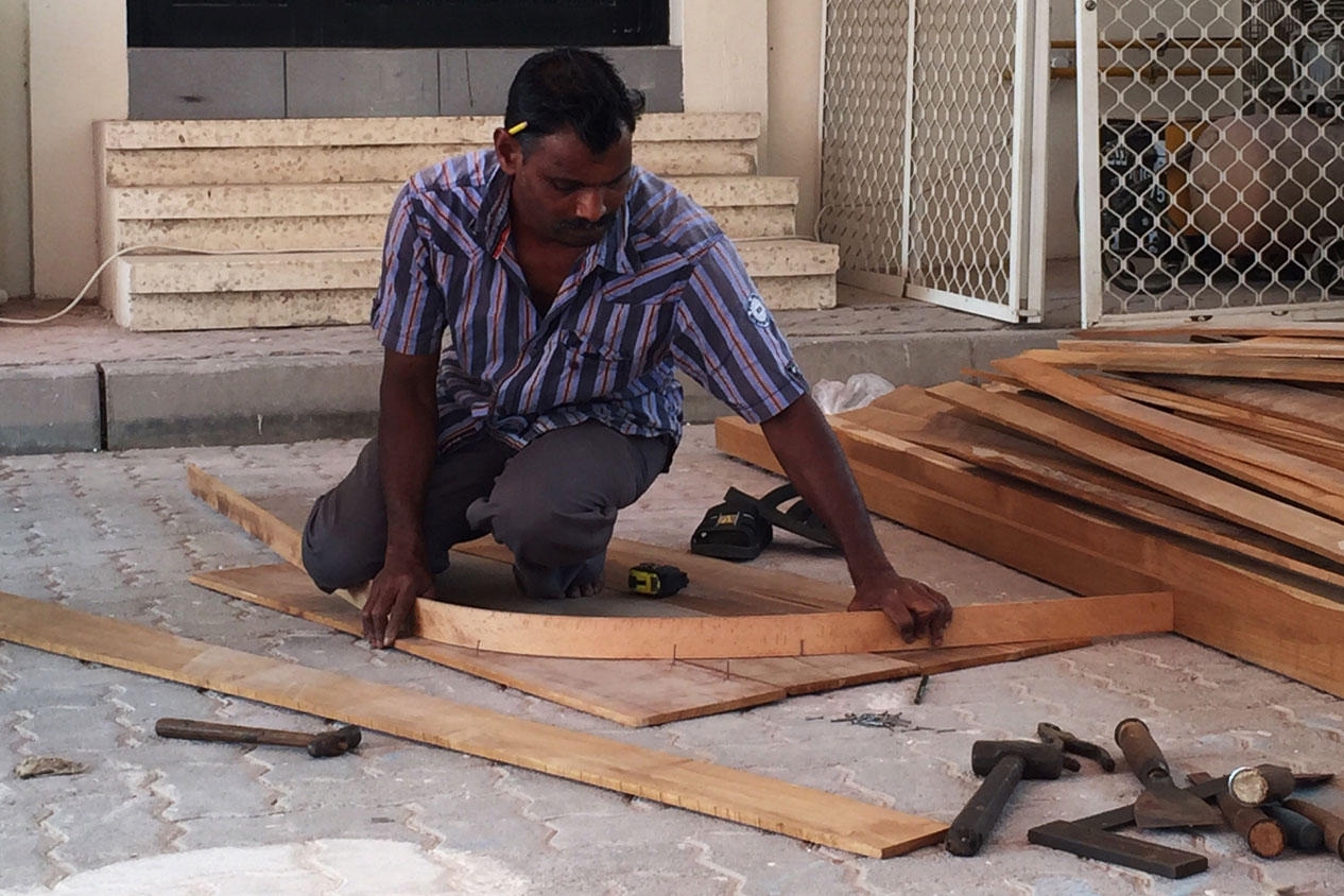 I'm collaborating with Muttayya, who is a dhow builder originally from Mangalore, India. He is what they call an 'ostath' or master of his profession. Muttayya is an extremely skilled carpenter able to execute impeccable work at both large and small scales, which made him the ideal collaborator on a furniture project.