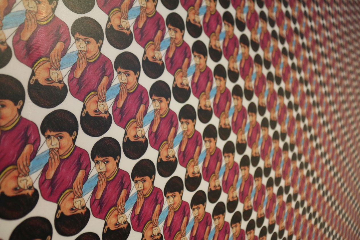 Maryam de-contextualizes a figure – a child sipping water from a glass, from its original source, which is an educational sign. She then manipulates this found image and multiplies it to cover one walls of her studio. The intense pattern of the wallpaper invokes an exploration of image as text, in reference to the instructional tone of the work’s title. The Morals of Eating may slightly disturb viewers upon approaching the work, as the gaze of the figure is directed towards the onlooker. It also invites visitors to participate in the installation or perform a subtly instructed-act of sitting at the table. The table and two chairs that are placed in front of the wall paper thus act as mediators. Maryam’s objective is not to tell the viewers what to think or feel but let them reflect on visual politics in their own ways.