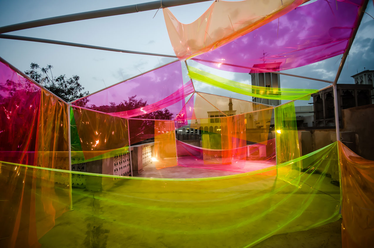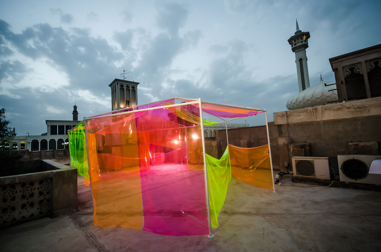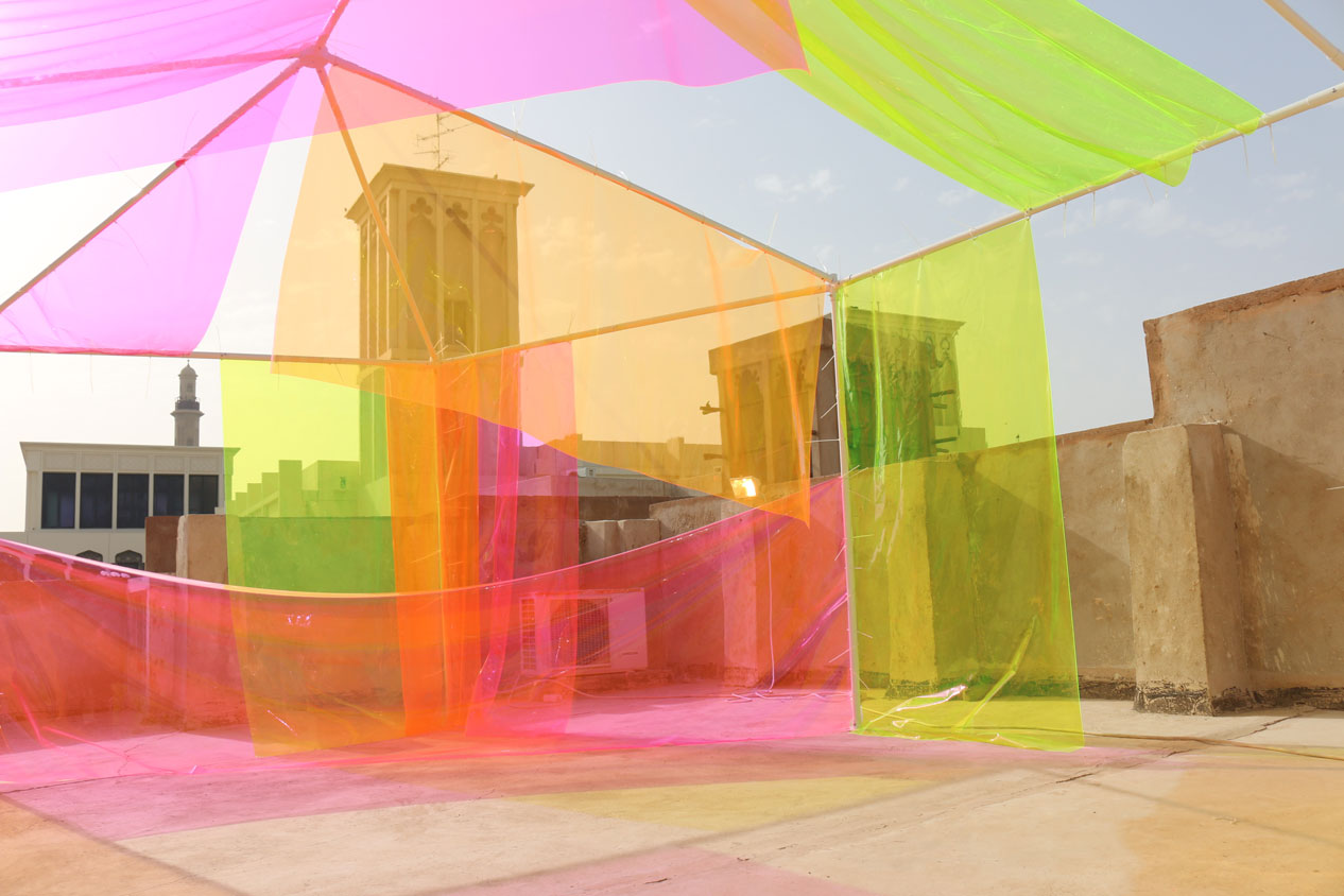 Most-widely recognized for her distinct crochet work, which blurs the boundaries between crafts and art, Sara Al Haddad’s practice is highly driven by materiality and tactility. Sara had previously shown in Al Fahidi at last year’s SIKKA. Her site-specific installation, titled without, combined crocheted yarn and dust, which she collected from the alleys and courtyards of the neighbourhood. Focusing on dust’s akin relationship to memories, Sara responded to Al Fahidi’s historical shift from being a residential area, established in the late 19th century, to a tourist destination with museums, handcrafts shops and cafés. Working in this context for the second time, the artist decided to investigate how transparent and vivid-coloured plastic material interacted with the space and under different light conditions. Contrary to her earlier life-size sculptural piece, where she used natural material, Sara focused on experimenting with industrial materials in her new site-specific hence.