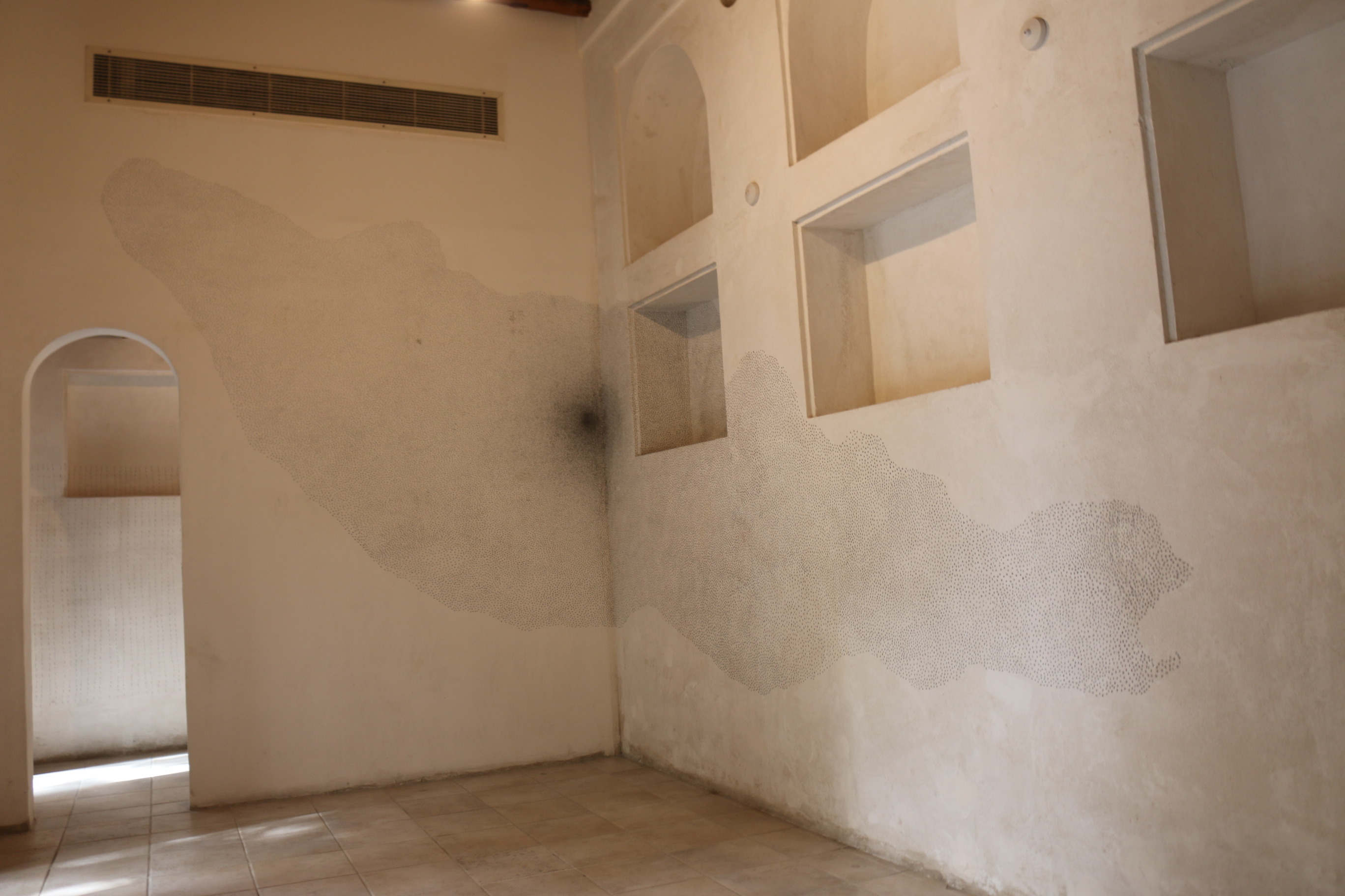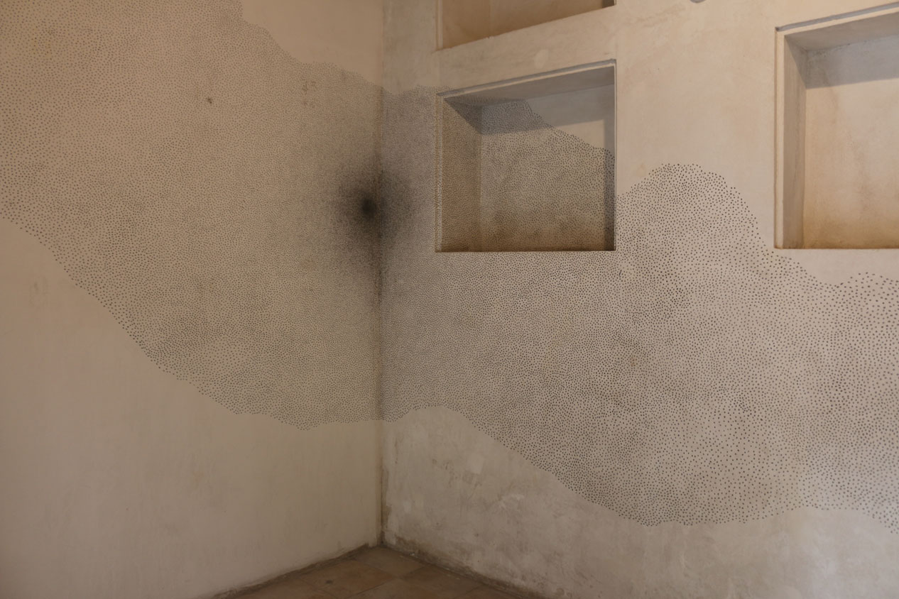 Sunoj’s drawing almost takes over the whole studio. His rhythmic composition of grain-like and linear marks invites the viewer to engage with the peculiar dynamics of his studio, which is divided by a wall and has a wind-tower. While lines representing dirhams and dollars in two opposite corners appear more orderly, the circular shapes that refer to rupees organically-spread throughout the center of the studio. The artist avoids perfection in his gesture of marking the walls. Contrary to its ephemeral nature, zero to the right also addresses notions of memory and authenticity in the space without overshadowing the history of the residency house itself.