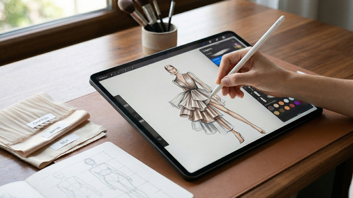 In the final session, participants develop a digital mood board and transform their ideas into a complete fashion illustration, refining line work, textures, and overall presentation.