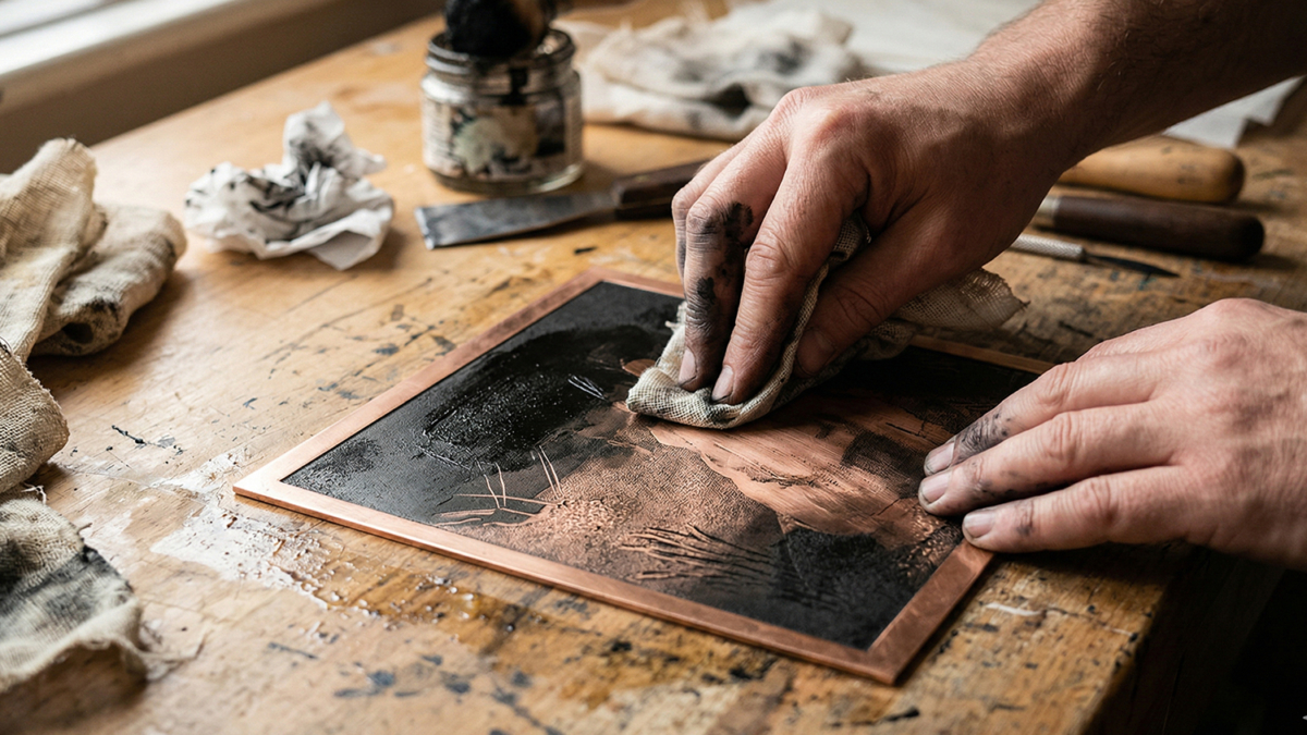 Designed for artists interested in exploring tone, atmosphere, and depth, the workshop introduces how to create subtle gradients and rich tonal effects using acid etching on metal plates.